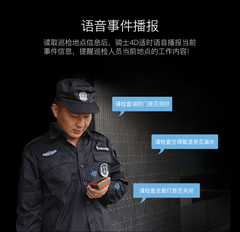 手持騎士4D巡檢器巡邏讀取地點(diǎn)信息后,適時(shí)語(yǔ)音播報(bào)當(dāng)前時(shí)間信息,起到督促提醒的作用,減少因?yàn)檫z忘需要重點(diǎn)巡檢的工作而發(fā)生重大安全隱患。