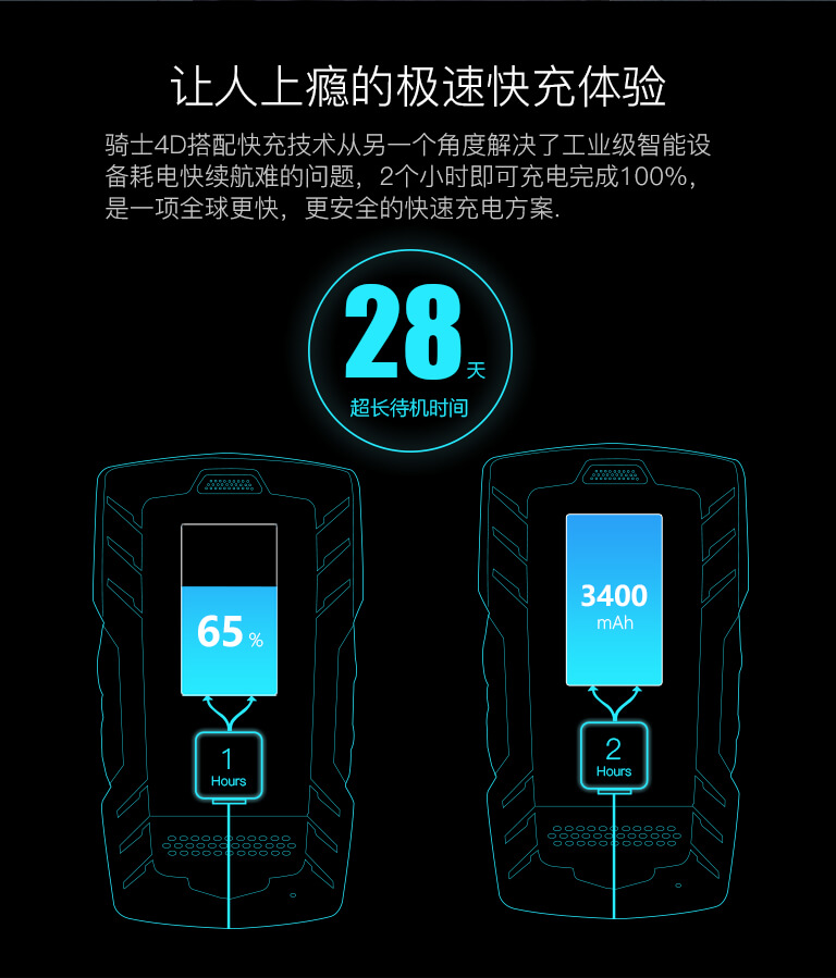 騎士4D搭配快充技術(shù)從另一個(gè)角度解決了工業(yè)級(jí)智能設(shè)備耗電快續(xù)航難的問(wèn)題,2個(gè)小時(shí)即可充電完成100%,是一項(xiàng)全球更快,更安全的快速充電方案。