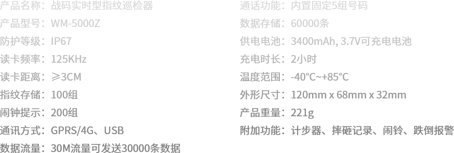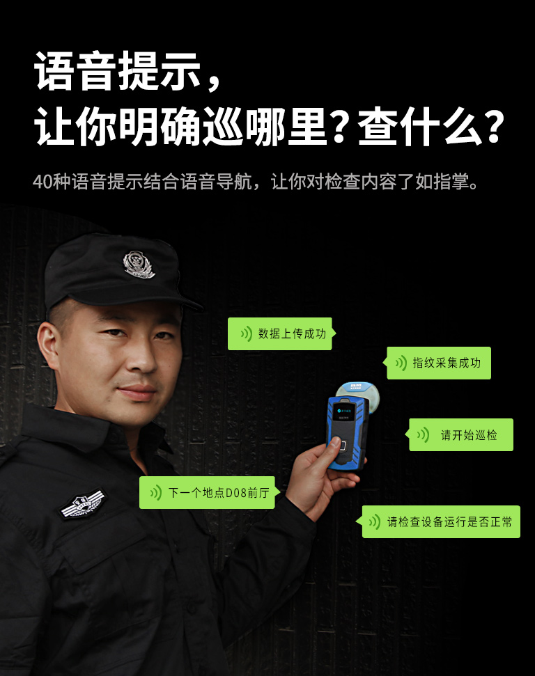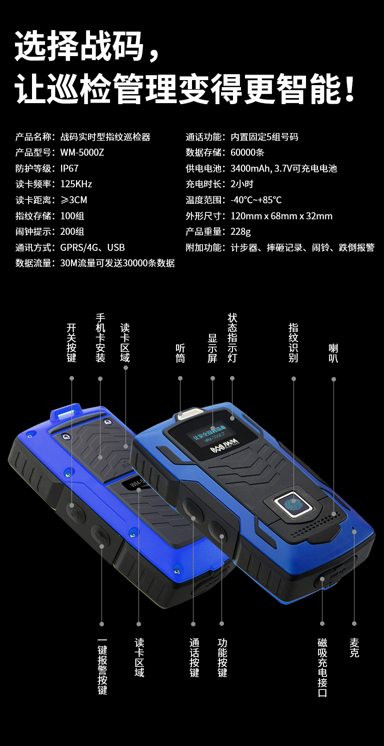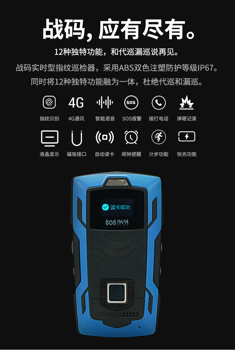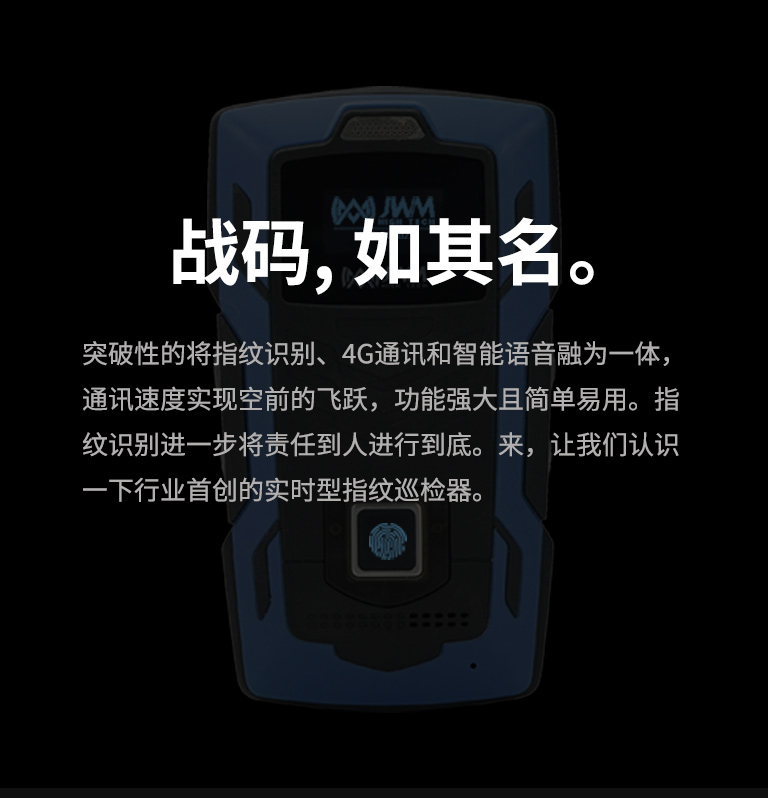 突破性的將指紋識別、4G通訊和智能語音融為一體,通訊速度實現(xiàn)空前的飛躍,功能強大且簡單易用。指紋識別進一步將責任到人進行到底。來,讓我們認識一下行業(yè)首創(chuàng)的戰(zhàn)碼指紋實時巡檢器。
