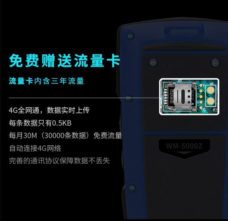 4G全網(wǎng)通,數(shù)據(jù)實時上傳每條數(shù)據(jù)只有0.5KB每月30M(30000條數(shù)據(jù))免費流量自動連接4G網(wǎng)絡完善的通訊協(xié)議保障數(shù)據(jù)不丟失