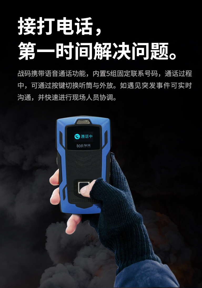 戰(zhàn)碼攜帶語音通話功能,內存5組固定聯(lián)系號碼,通話過程中,可通過按鍵切換聽筒與外放。如遇見突發(fā)事件可實時溝通,并快速進行現(xiàn)場人員協(xié)調。